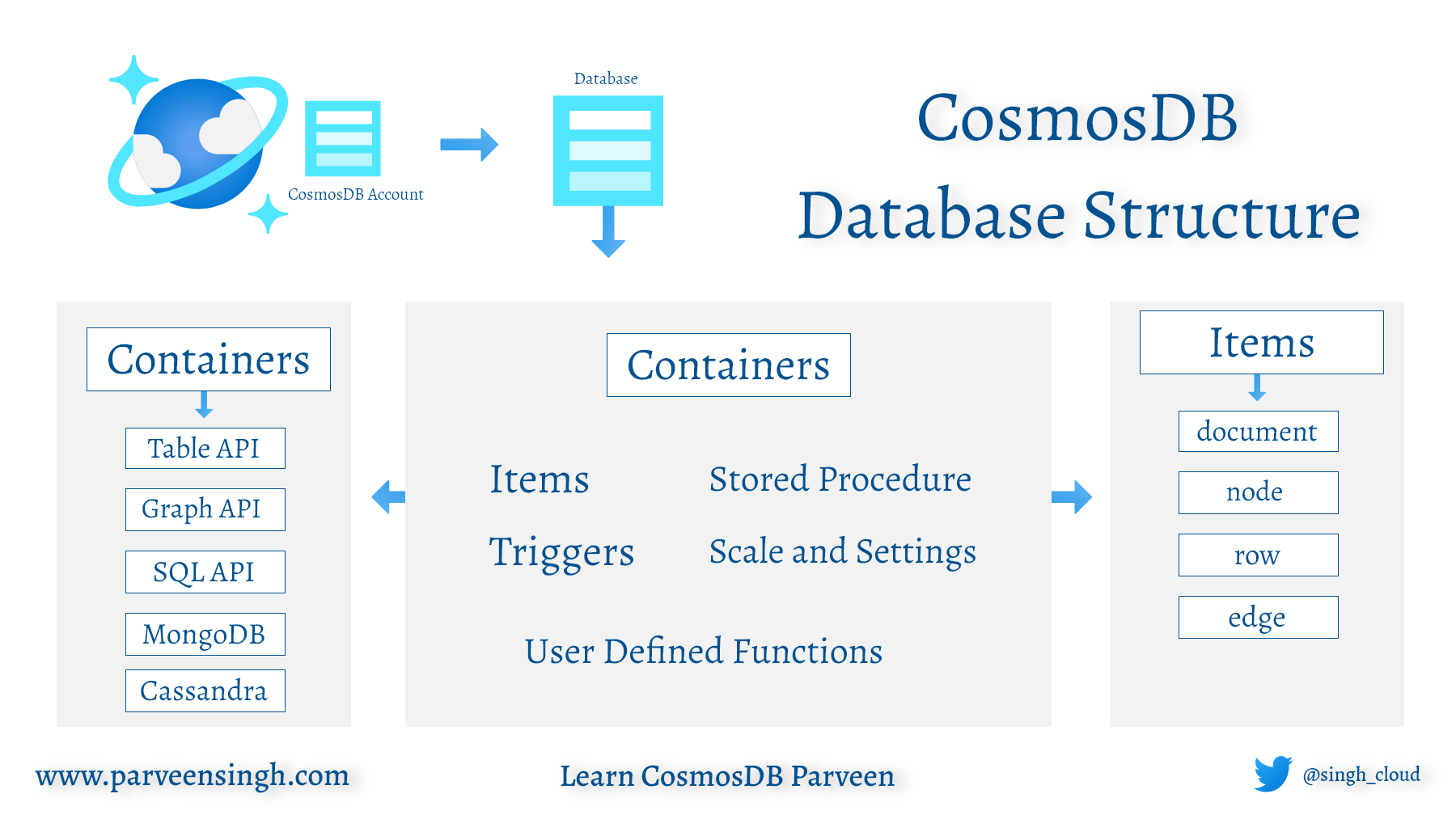 CosmosDB containers are the units inside the database that govern scalability for both throughput and storage. Containers are horizontally partitioned and then replicated across multiple regions. The items inside a container are automatically distributed based on the partition key.