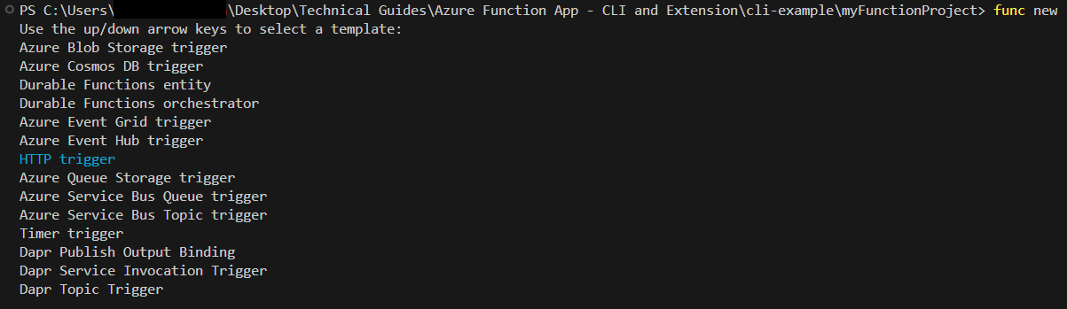 func newThis command will prompt you to select a template for the new function. Select HTTP trigger and provide a name for the function (e.g.,HttpTriggerFunction).