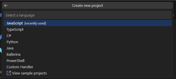 Ctrl+Shift+P), search Azure Functions: Create New Project select Azure Functions: Create New Project: