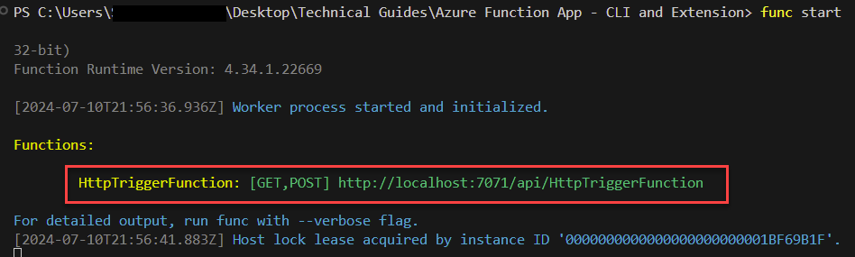 myFunctionProjectdirectory, run the following command:func start