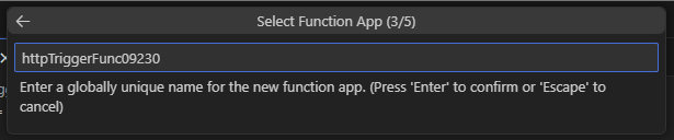 - On the next step, enter a globally unique name for the function app and press Enter:
