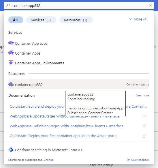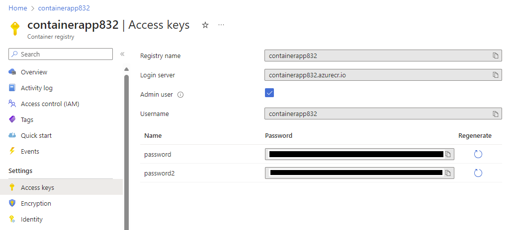 To access the container registry Access keys, go to the Azure Portal search bar and type the name of your Container Registry. In this case, containerapp832.