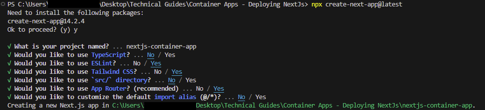In this section, you'll create a new Next.js project to serve as the foundation for your deployment. You'll use the npx create-next-app@latest command to quickly set up a Next.js application and ensure it's running correctly on our local machine. Ensure that you have NodeJS installed on your system before proceeding with the instructions.