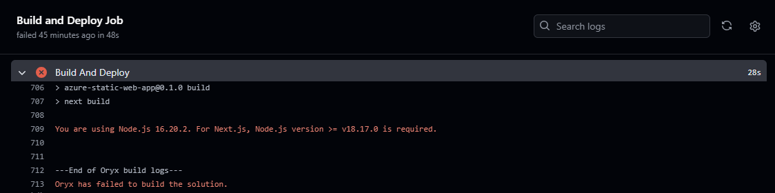 💡 This error indicates that the Node.js version used in the build process is incompatible with Next.js. Next.js requires Node.js version >= v18.17.0. Add the following section to your