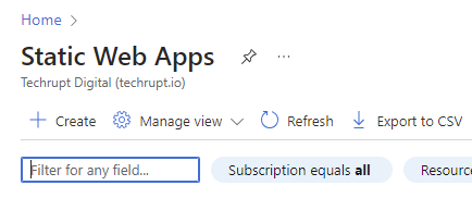 On the Static Web Apps page, click on (+)Create: