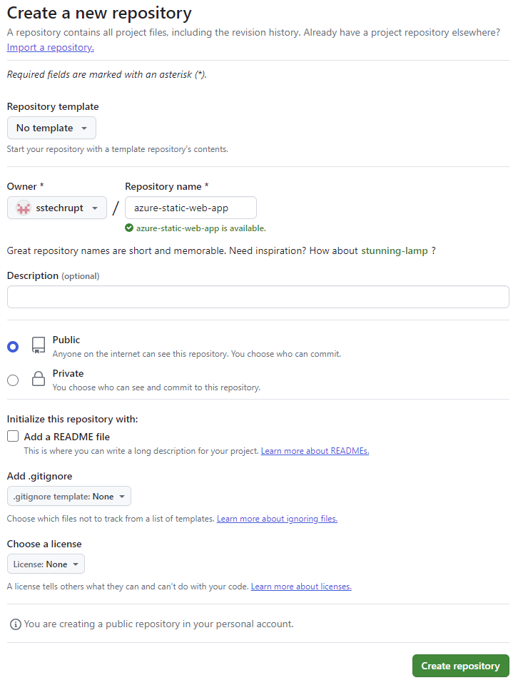 - Repository name: Enter a name for your repository.