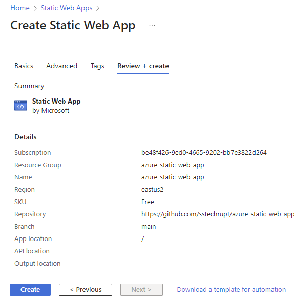 On the Create Static Web App page, fill in the following information and click Review + create: