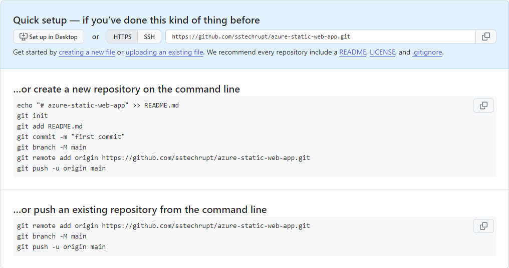 - Initialize your GitHub repository by using the commands you copied from GitHub quick setup instruction page: