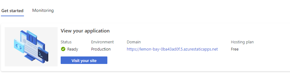 Under the Get started tab, wait for the Status to show Ready and visit your website by clicking on the Visit your site button: