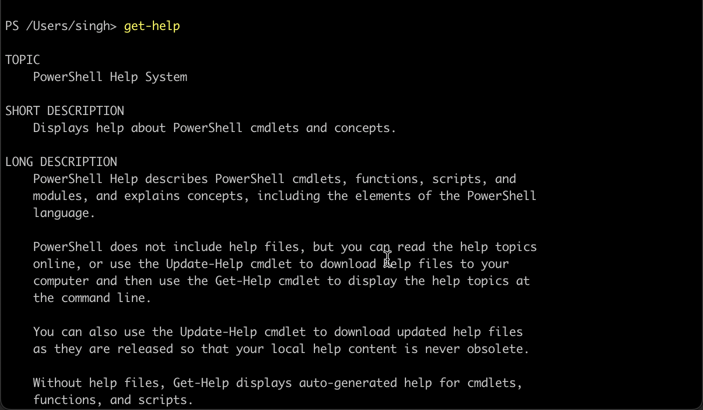 Another useful PowerShell command to be aware of in the beginning is the Get-Help command that can assist you in finding syntax and provide guidance on using all the available commands. For example, the output of Get-Help looks like this:
