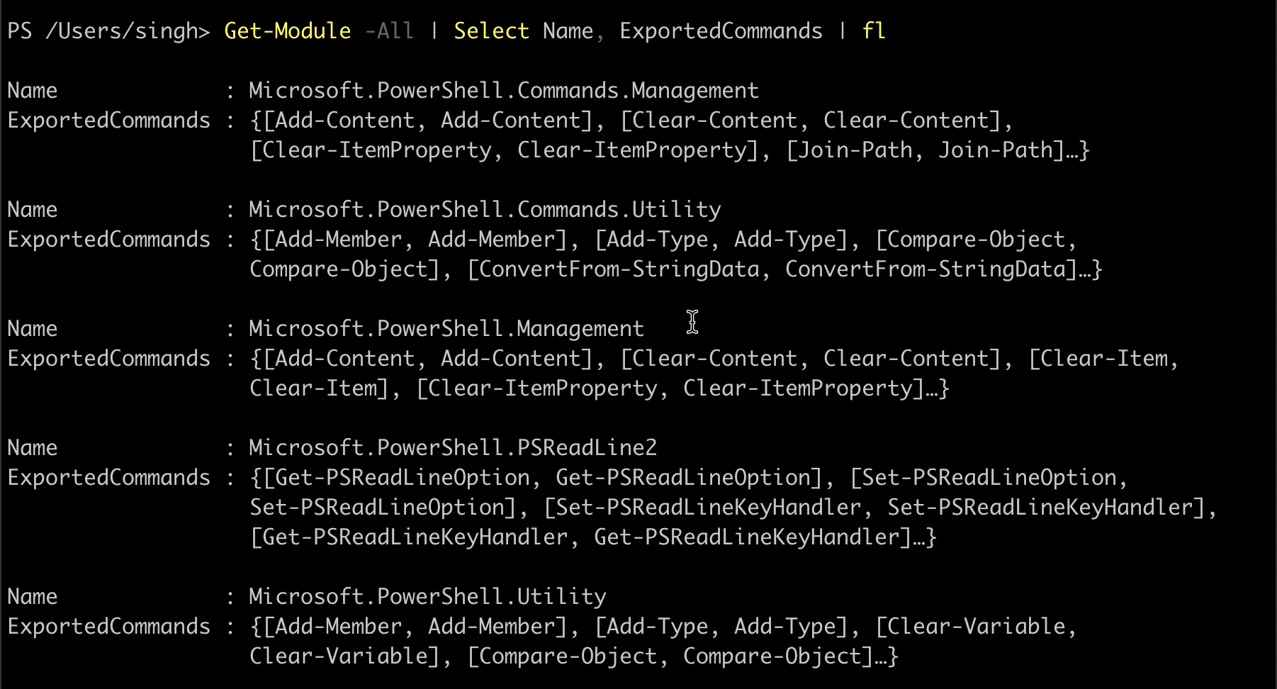 Running the Get-Module -All gives you a list of all the installed modules on your computer. Refer to the example where you can see the name of the modules and all the commands each module offers:
