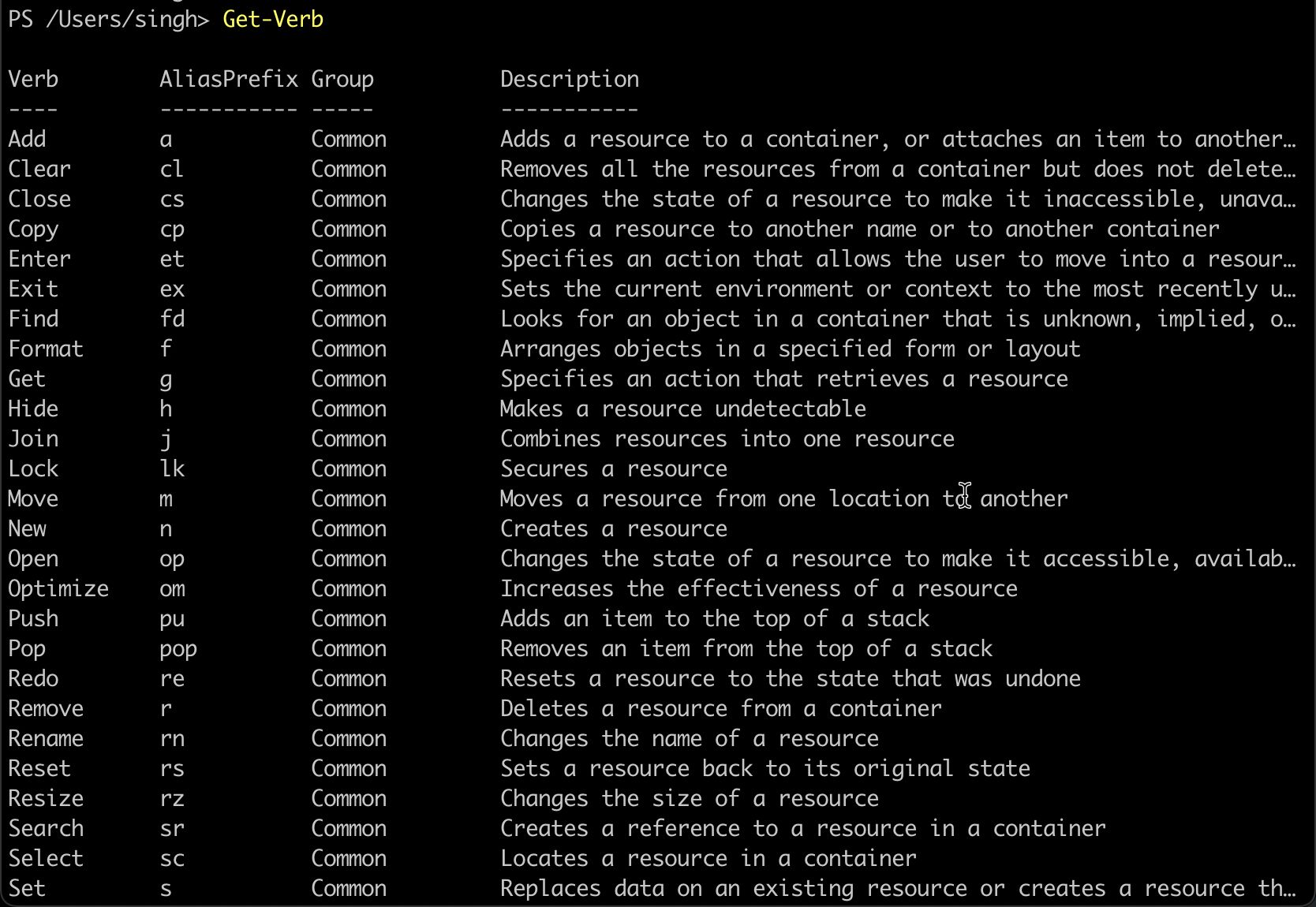 The results may vary in your case. However, notice from the above image, the verbs are grouped (Group) based on their purpose and display an alias (AliasPrefix) that you can use to call the command without typing in the full name.
