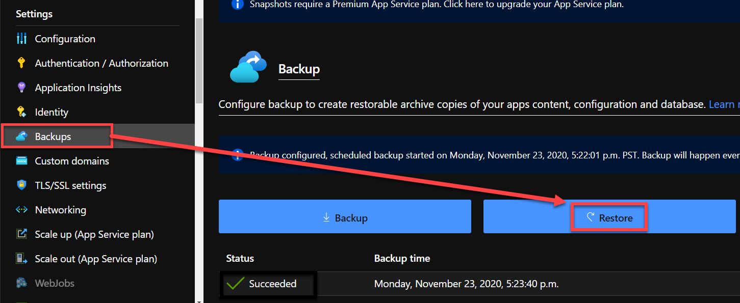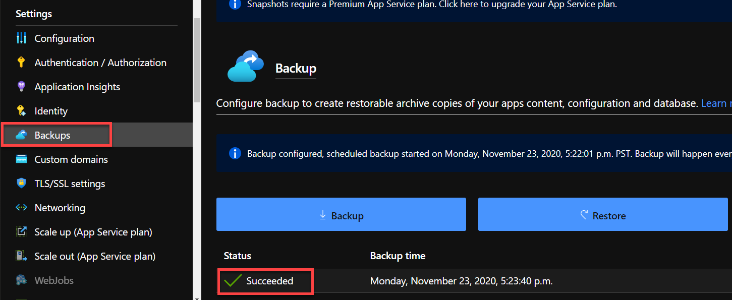 - Your app service plan is running on at least Standard Tier to perform the backup and restore operation on the application. This operation cannot be performed on the Basic/Free Tier applications.