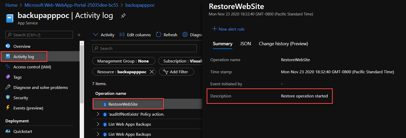 - Once the restore process is triggered, navigate to "Activity Log" for the web app resource and confirm the activity progress as it performs the restore.
