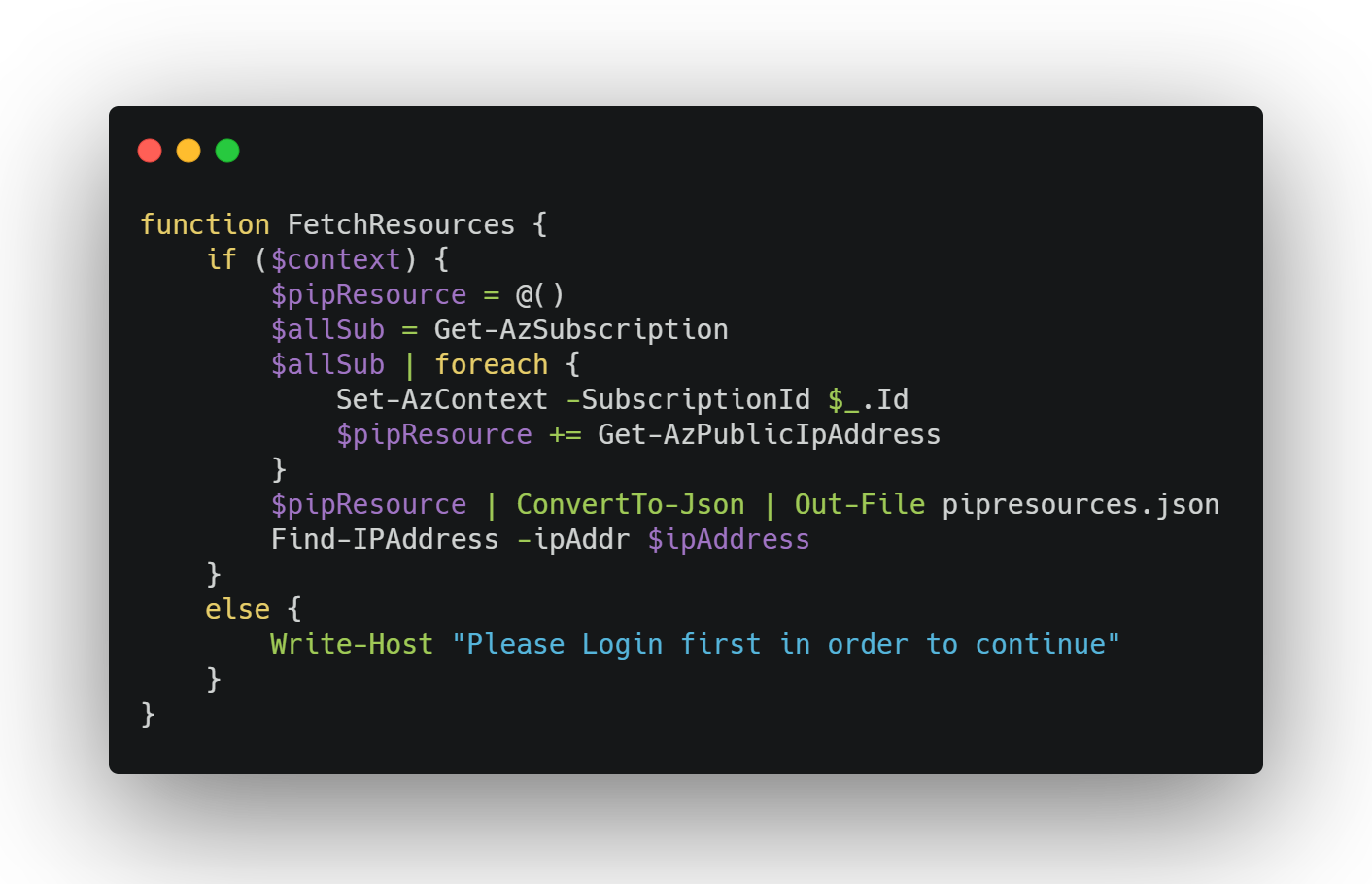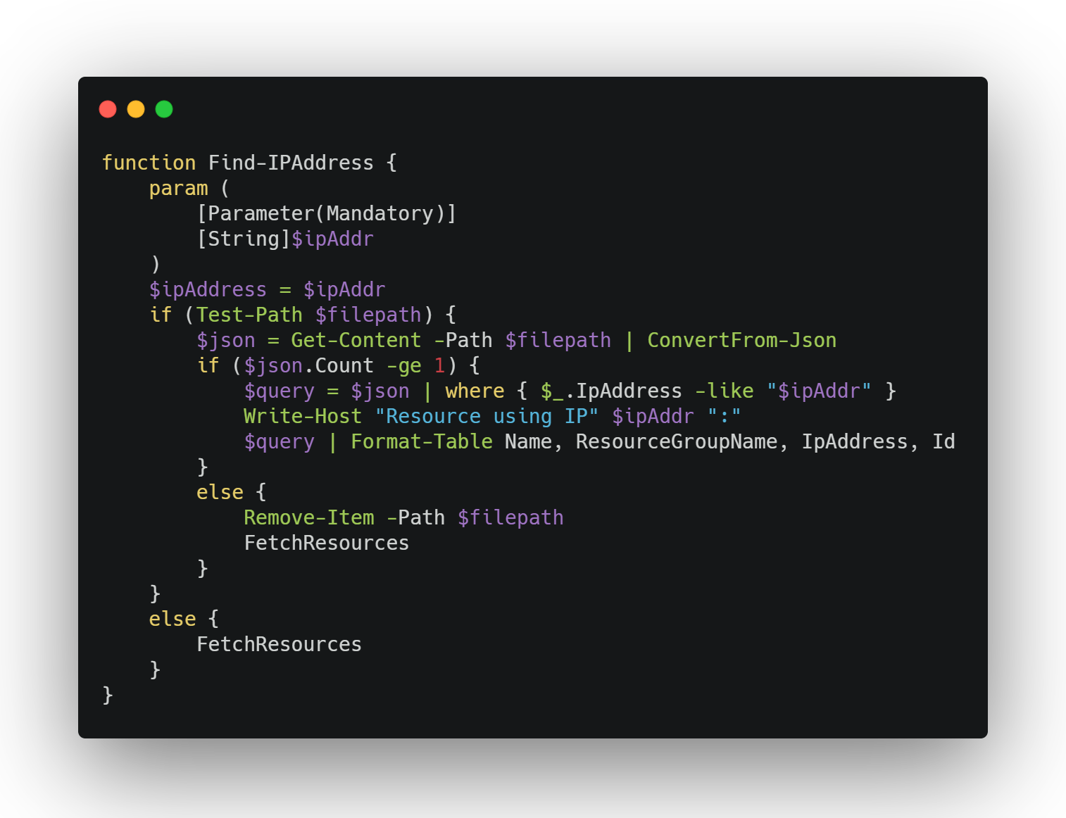 Find-IPAddress is the core function which does 2 things. It takes in an IP Address from user that we want to search for check if the cached file already exist from last time under the same folder and then pass the IP to query. If the file doesn't exist already, it'll re-run the FetchResources and recreate the file with updated information about the resources and perform the query automatically with the IP entered initially.
