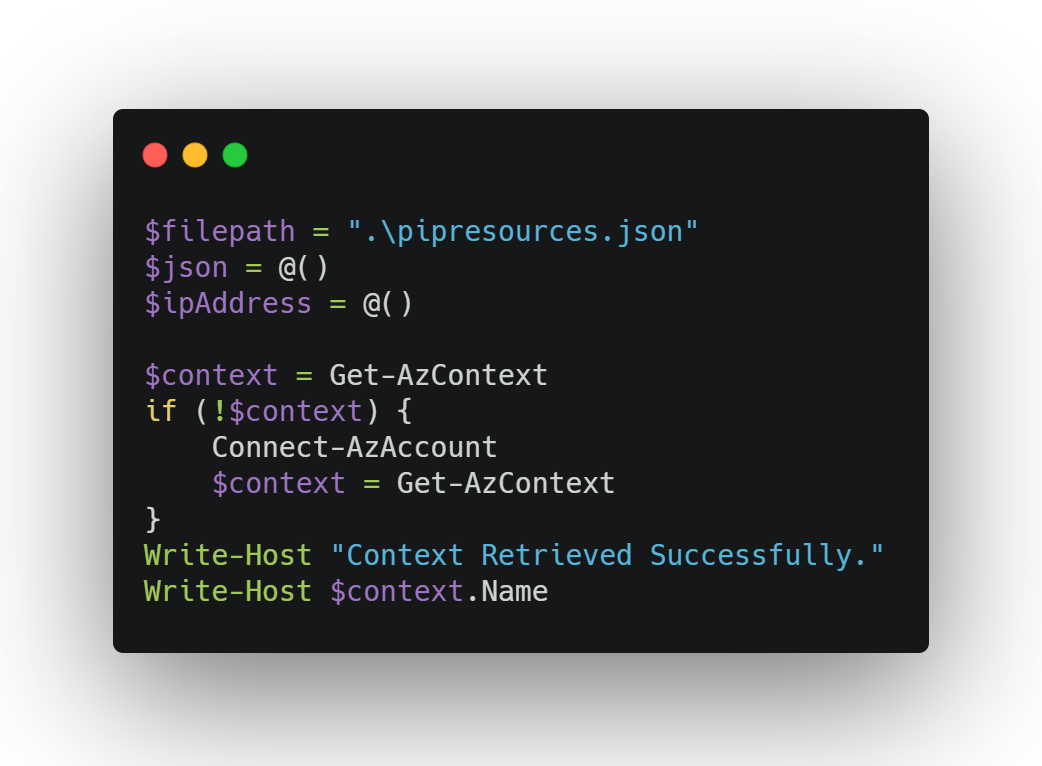 $context variable validates that user is logged in and able to query resources from Azure Subscription. This saves us from logging into Azure every time we run the script.