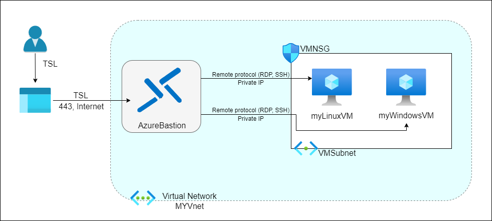 In this updated diagram, users connect to their VMs through Azure Bastion using a secure TLS tunnel, ensuring data security and integrity. The VMs remain within the VMSubnet and are protected by the Network Security Group (vmNSG), with Azure Bastion acting as a secure gateway. This architecture not only improves security but also simplifies the management of remote connections, providing a seamless and safe way to access your virtual machines.