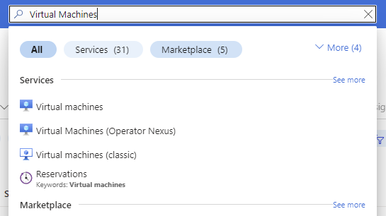 In the Azure search bar, type Virtual Machines and select Virtual machines: