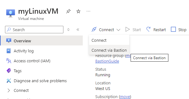 The Bastion service created can now be used to securely connect to all the Virtual Machines in your Virtual Network. Test your Bastion service by connecting to a different VM. In my case, I will connect to my conveniently named myLinuxVM.