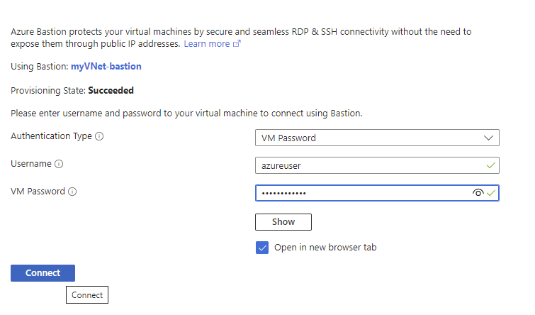 Now that your Bastion service has successfully deployed, test it by using it connect to some of the other VMs in your VNet.