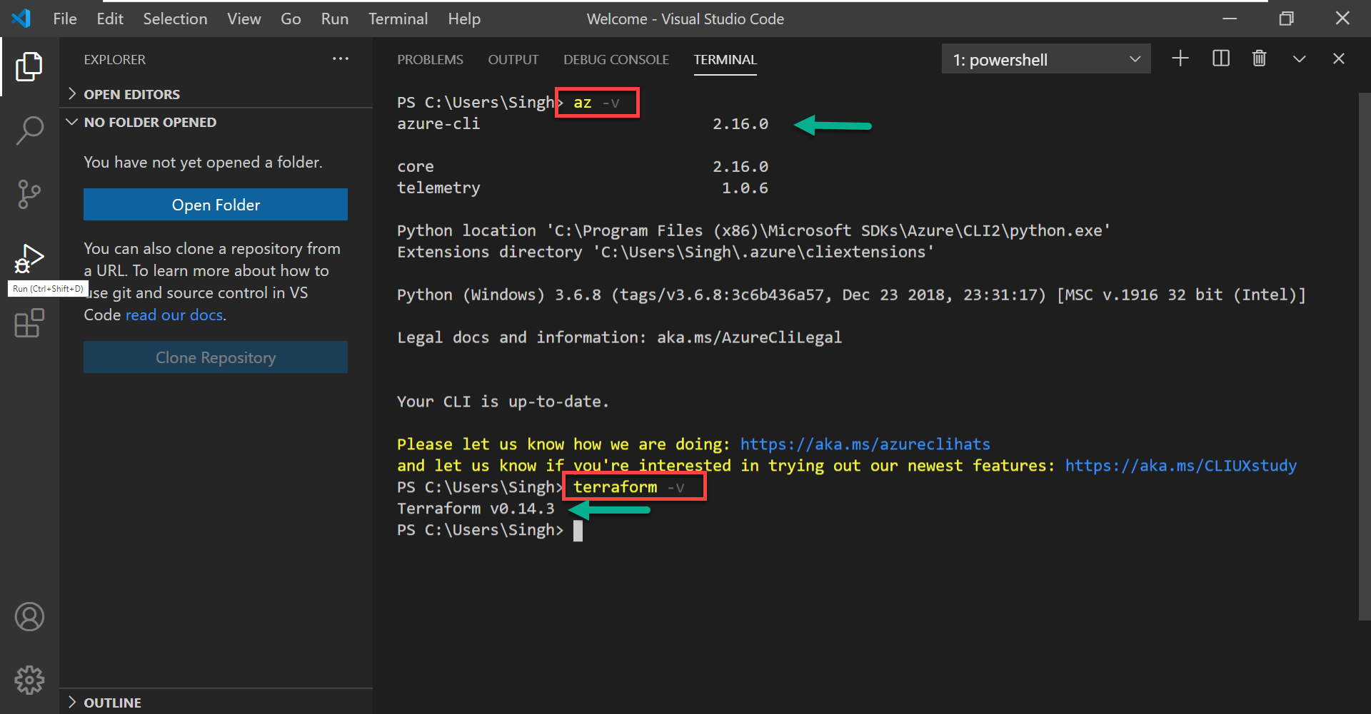 Now that you have done all the necessary installations, open a terminal to test the installation before moving forward with writing anything. You can either use PowerShell or use Terminal in VS Code session by clicking `Ctrl+``(backtick).