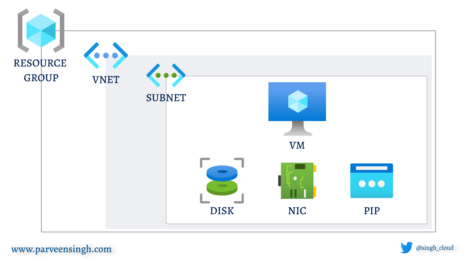 If you recall from the previous article, you need to plan out your deployment and resource prior to writing anything in terraform configuration. This is the best time to think of what resource you might need in Azure and then draw a high-level diagram to add any necessary dependencies. Since we are going to deploy a VM, I have the following diagram that I'll add to terraform config one resource at a time to create the overall architecture. Let's begin: